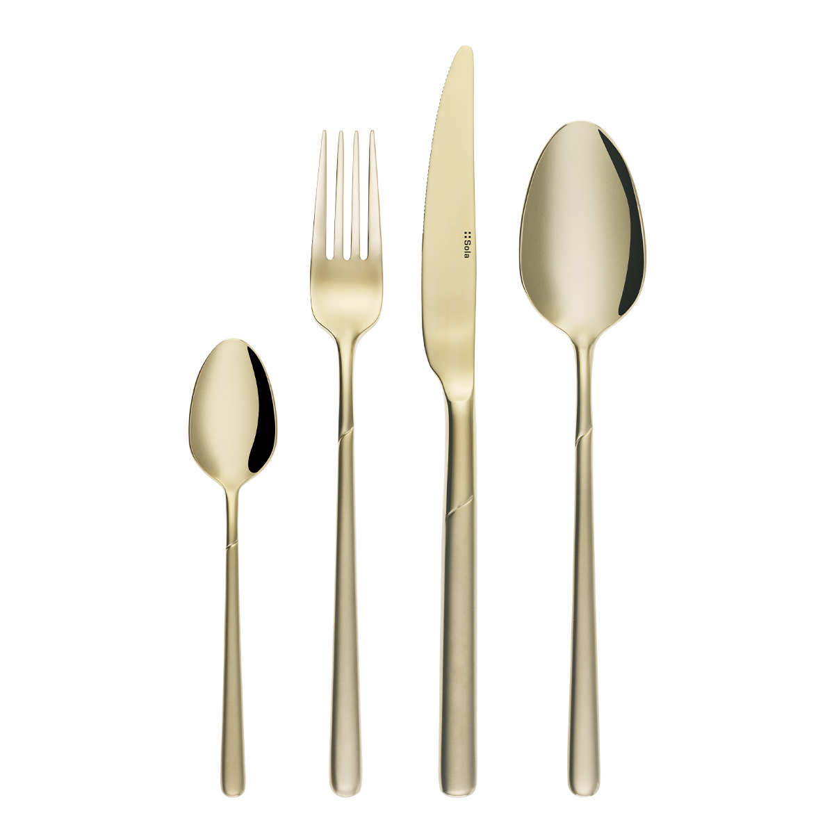 Tűnjön ki a tömegből! A pezsgőszín rendhagyó árnyalata ötvöződik a lekerekített végű homokfúvott nyéllel és a fénylő evőeszközfejjel. Ez a kifinomult extravagancia viszont nem mutatja a hivalkodás jeleit. Kialakításának köszönhetően ez a vonalvezetés univerzális, könnyen kombinálható kiegészítővé teszi. A készlet tartalma: 4x kanál 4x villa 4x kés 4x kávéskanál