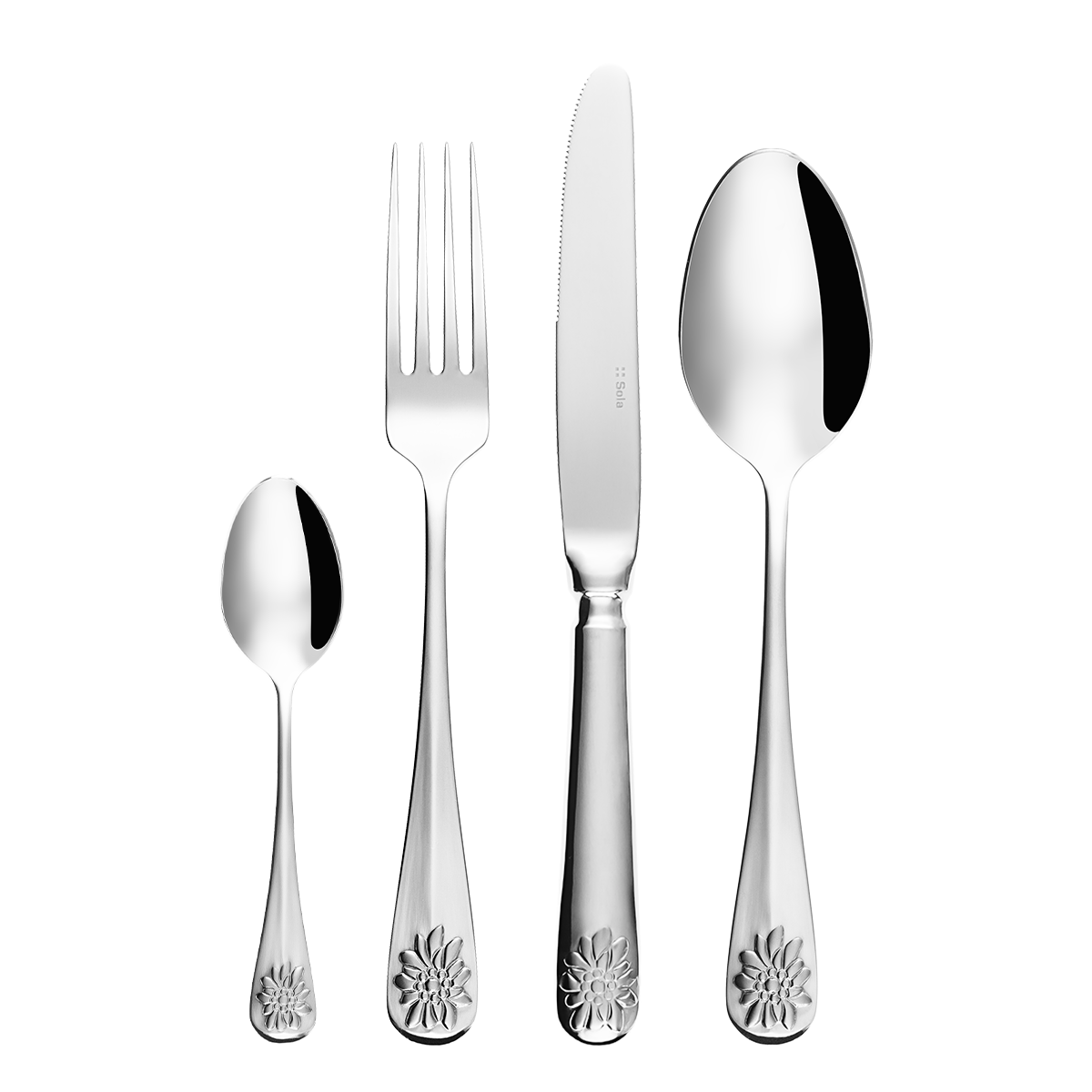 A Baguette Vintage Edelweiss evőeszközkészlet időtlen dizájnjával és finom virágos részleteivel a nyélrészen kifinomult eleganciát ad a készletnek. Tökéletes hagyományos és modern étkezésekhez, luxust és stílust hozva a konyhába.