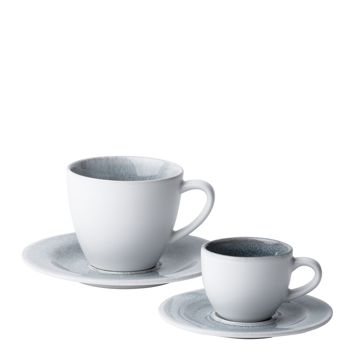 Kívülről matt, belülről fényes. A Gaya Atelier Glacial Ice kollekció egyedi porcelánja. A színes felülete egy befagyott tó felszínére emlékeztet. A fagy egyedi mintázatokat hoz létre a természetben. Ennek a kollekciónak minden egyes porcelánját ehhez hasonló motívumok díszítik. Kávézzon elegánsan a füles csészékből a csészealjjal együtt. Már csak azt kell eldöntenie, hogy egy rövid eszpresszóra vagy éppen egy hosszú amerikai kávéra kapott kedvet. .= A reaktív máz miatt minden egyes darab eredeti, így a színárnyalat vagy a minta eltérhet a képen látható termék dizájnjától. .= A készlet tartalma: 4x kávécsésze (250 ml) 4x kávéscsészealj (15,5cm) 4x mokkáscsésze (90 ml) 4x mokkáscsészealj (12cm)
