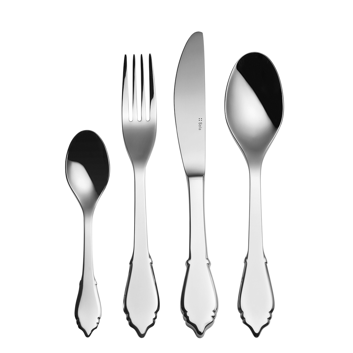 A gyönyörű evőeszköz időtálló eleganciával nagyszerűen illik minden királyi lakomához. Az evőeszköz készlet ideális társ az ünnepi alkalmakhoz. A kés markolata üreges. A készlet tartalma: 6× leveses kanál 6× kés 6× villa 6× kávéskanál