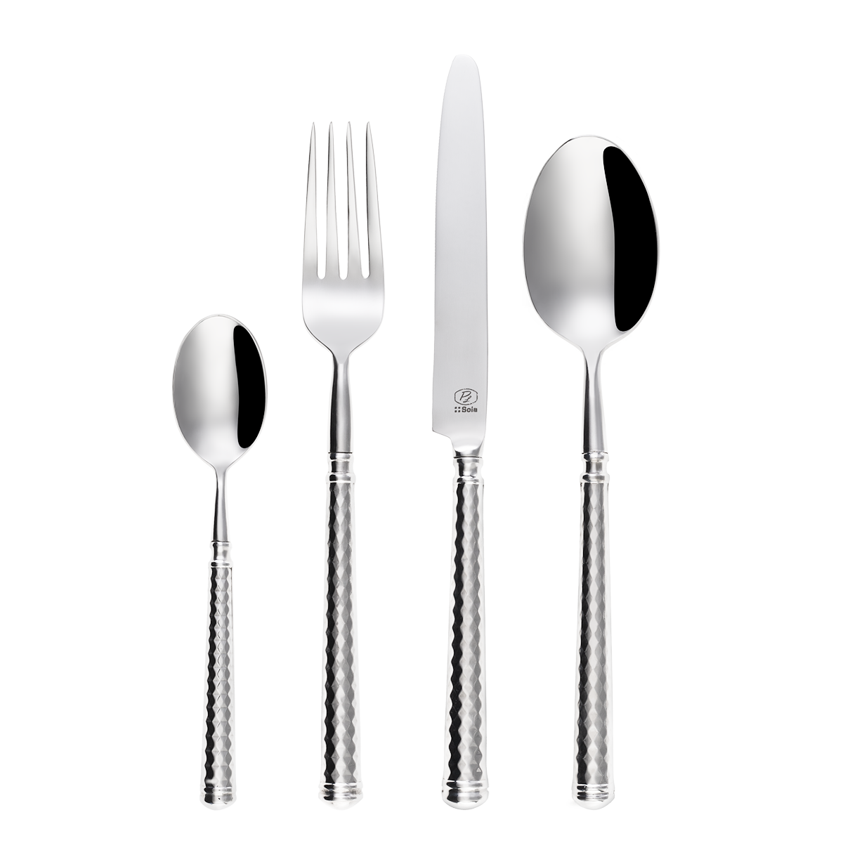 A fényűző Platinum Line kollekció Cubism 21st Century evőeszközkészlete. Minden darabja kézzel készült, üreges nyéllel. Az apró gyémánt mintával díszített nyelek kifejezetten az igényes vásárlók számára készültek modern, rusztikus belterekbe. A készlet tartalma: -6x kanál -6x kés -6x villa -6x kávéskanál
