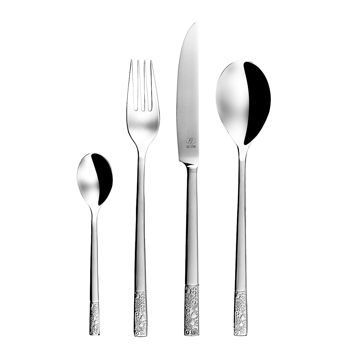 A fényűző Platinum Line kollekció Fiori evőeszközkészlete. Minden darabja egyedi, kézzel készült, üreges nyéllel és virágokkal díszítve. Modern vagy rusztikus beltérrel rendelkező igényes vásárlóink számára kiváló. A készlet tartalma: -6x kanál -6x kés -6x villa -6x kávéskanál