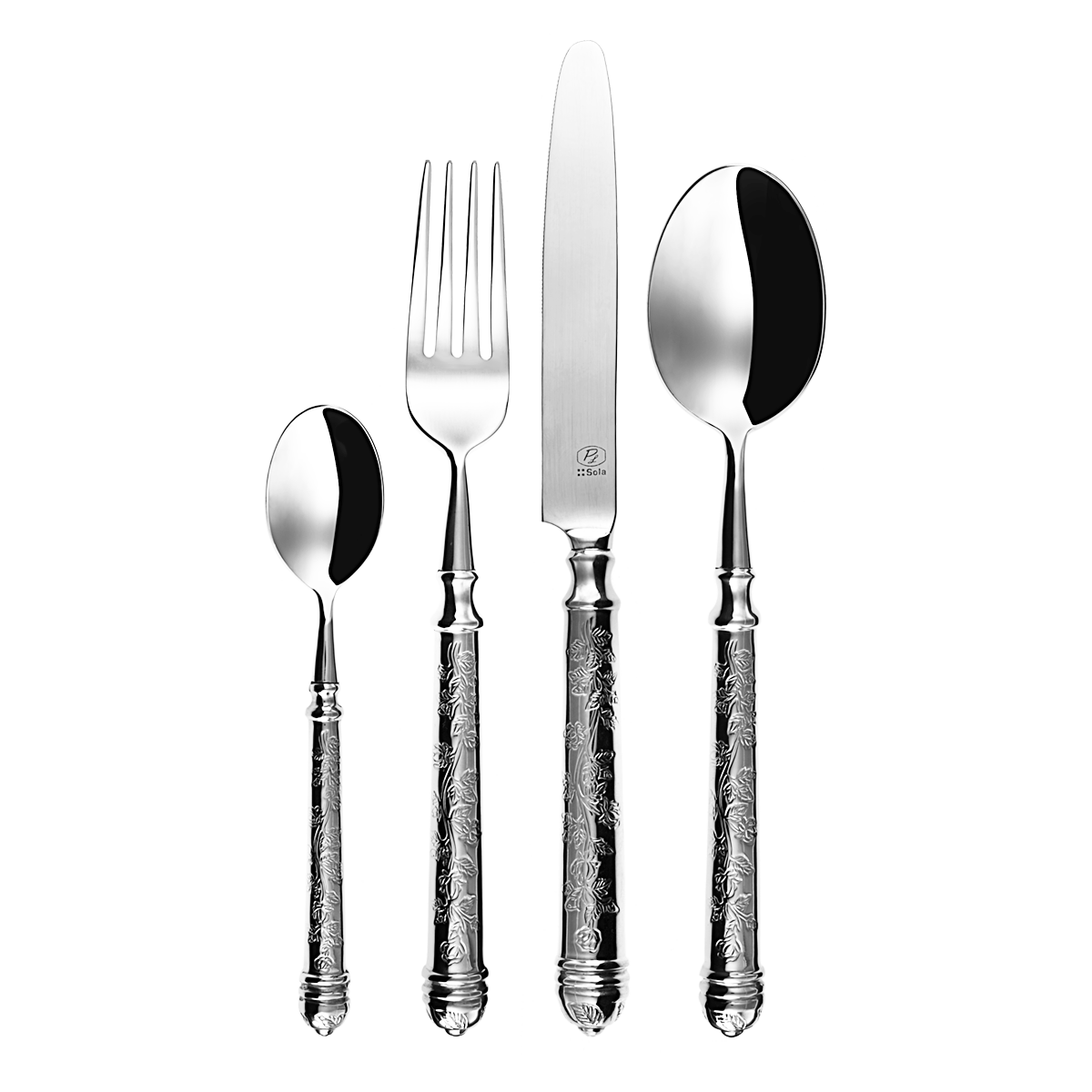A Platinum Line kollekció Santiago evőeszközkészlete. Minden darabja kézzel készült, üreges nyéllel és rusztikus formatervezéssel. A gazdagon díszített vaskos nyelek kifejezetten az igényes vásárlók számára készültek rusztikus belterekbe. A készlet tartalma: -6x kanál -6x kés -6x villa -6x kávéskanál