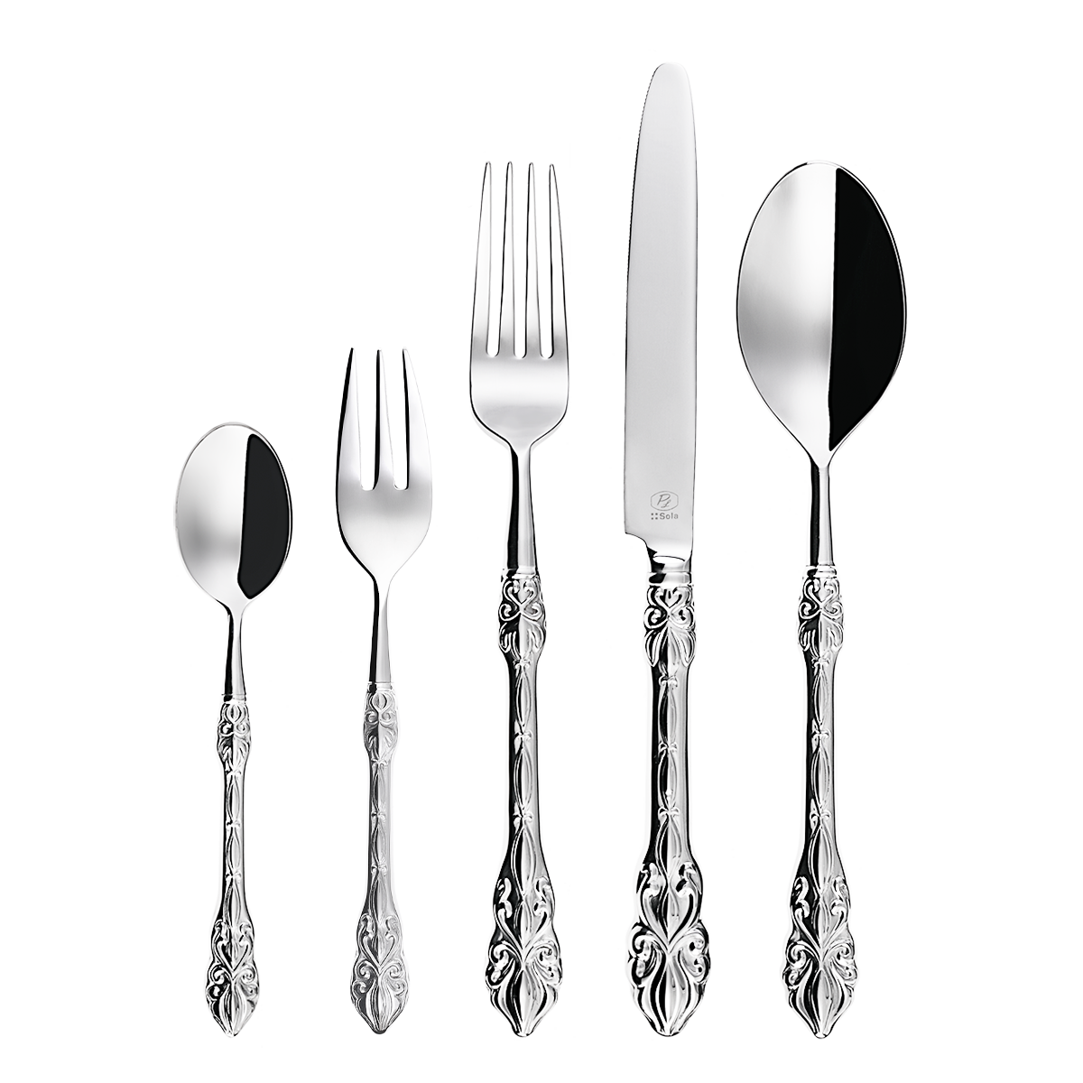 A Neuschwanstein evőeszközkészlet ötvözi a rusztikus dizájnt az eleganciával. Minden darab gazdagon díszített nyelére a Neuschwanstein kastély inspirálta mintázat jellemző, és kiváló minőségű rozsdamentes acélból készült. A kézzel készített evőeszközök masszív, rusztikus fogantyúi ideálisak az igényes vásárlók számára, és alkalmasak mind hagyományos, mind modern terítékekhez. Ez a készlet nagyszerű választás mindennapi használatra és ünnepi alkalmakra egyaránt, stílust és minőséget kölcsönözve az étkezéseknek.