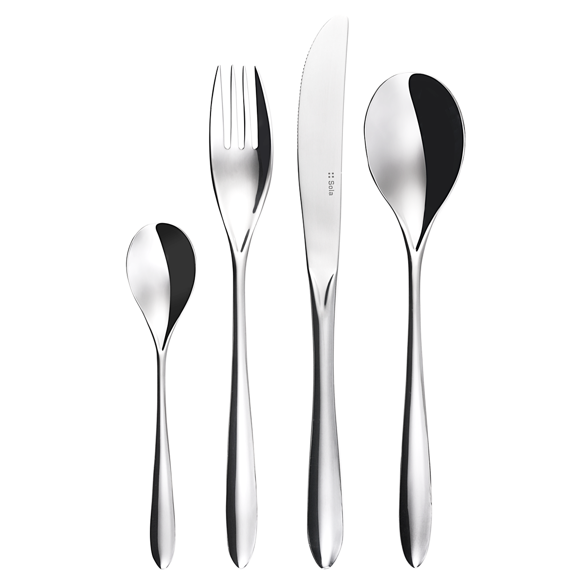 Ez az európai evőeszköz-dizájn a sima, kecses formáiról ismert. Nagyon népszerű az igényes, modern enteriőrrel rendelkező ügyfeleink körében. A készlet tartalma: 6× kanál 6× kés 6× villa 6× kávéskanál 6x mokkáskanál 6× tésztavilla