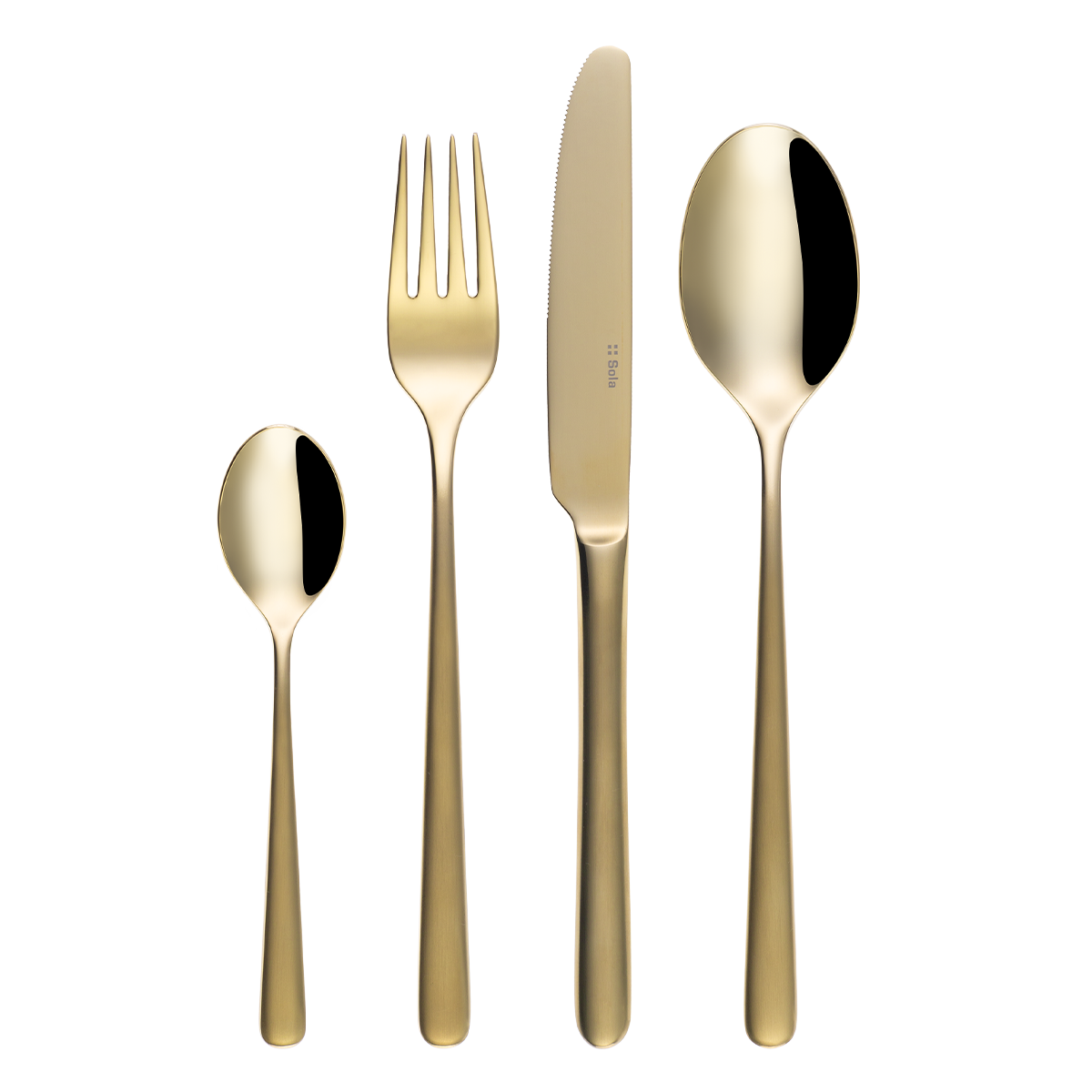 Örömet visz minden étkezésbe a Joy evőeszközkészlet meleg, aranyos árnyalatával. A rozsdamentes acél fényes felülete a sima nyéllel kombinálva harmonikus és prémium megjelenést kölcsönöz. Ideális választás azok számára, akik karakteres, mégis ízléses részlettel szeretnék gazdagítani az asztalterítést. A készlet tartalma: 4× evőkanál 4× villa 4× kés 4× kávéskanál