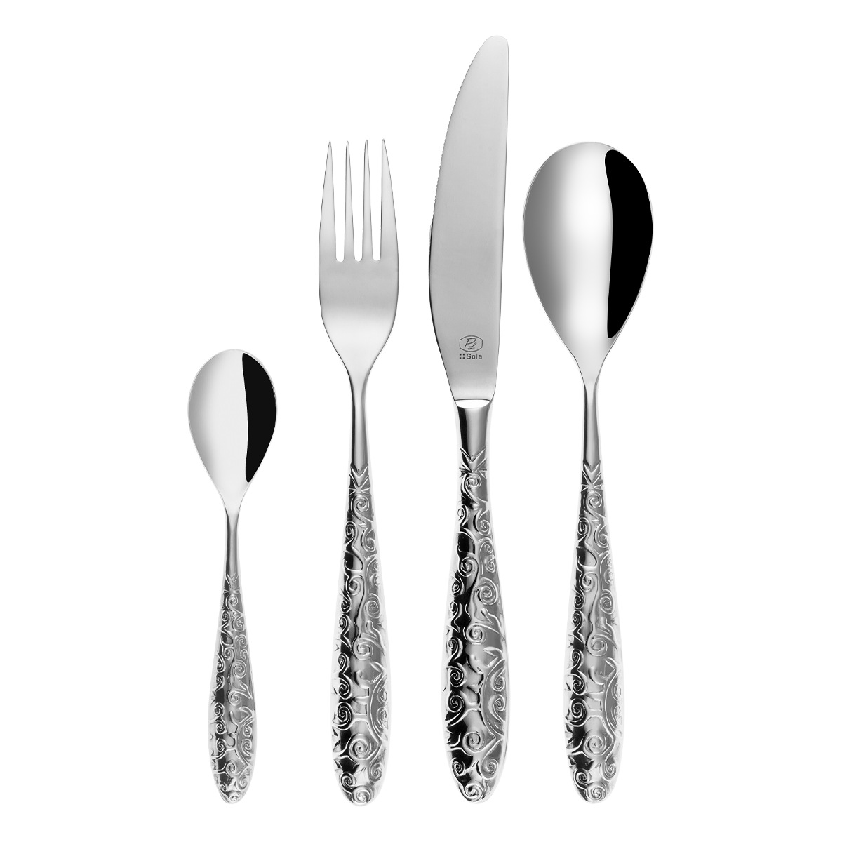 Az Eco Light evőeszközkészlet a Platinum Line kollekcióból finom, ugyanakkor figyelemfelkeltő dizájnjával tűnik ki. Az üreges nyelek, melyeket a természetes motívumokra emlékeztető domború minták díszítenek, egyedülálló bájt adnak a készletnek. A részletes kidolgozás és a könnyű konstrukció kombinációja révén az Eco Light ideális választás mindazok számára, akik eleganciát és egy kis eredetiséget keresnek. A készlet tartalma: 6 db kanál 6 db villa 6 db kés 6 db kávéskanál