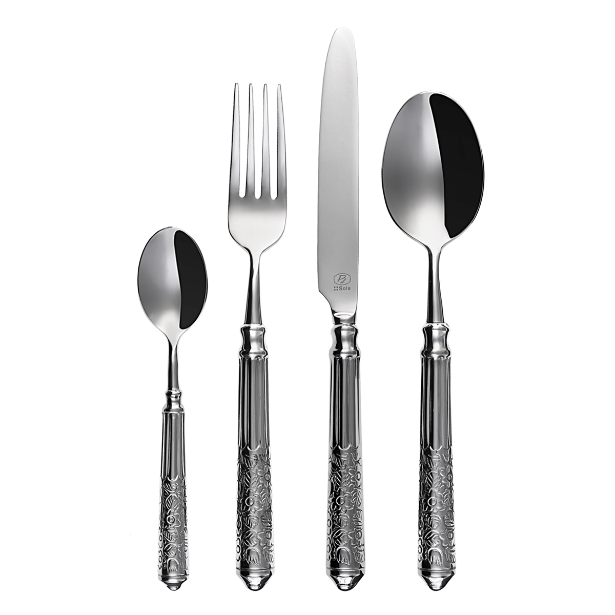 A San Remo evőeszközkészlet a Platinum Line luxusvonalából a mesterségi precizitást és a múlt varázsát ötvözi. Az üreges nyelek finom virágmintával kézzel készültek, és rusztikus bájt árasztanak. Minden egyes részletet a minőségre és szépségre helyezett hangsúly jellemez, hogy az étkezés valódi élménnyé váljon. A készlet tartalma: 6 db kanál 6 db kés 6 db villa 6 db kávéskanál 6 db desszertvilla 6 db mocca kanál 1 db salátás kanál 1 db salátás villa 1 db tortalapát 1 db leves merőkanál