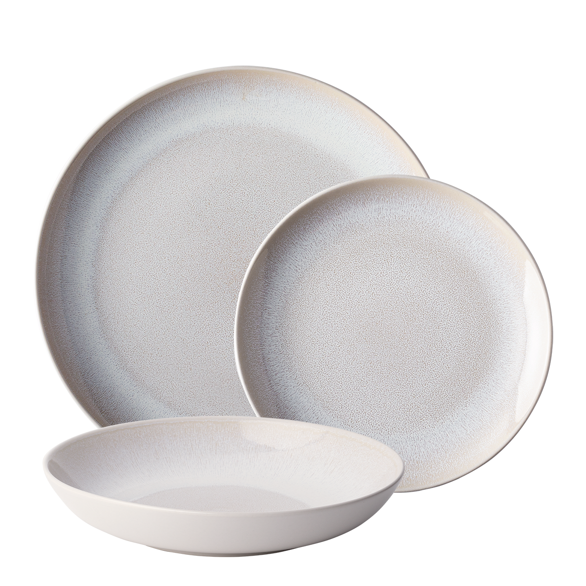 Az Elements North kollekció kerámia készlete egész évben a tél örömteli emlékeit idézi majd fel. A belseje középen részben havas tájra hasonlít, a szélei pedig hulló hópelyheket idéznek. Ahogyan élvezni fogja a tájat fokozatosan beborító fehér borítás látványát, úgy fogja élvezni az étkezés pillanatait is ezzel a készlettel. A reaktív máznak köszönhetően minden darab egyedi, és árnyalatban vagy mintázatban eltérhet a termékfotótól. A készlet a következőket tartalmazza: 4× sekély Coupe tányér (ø 27 cm) 4× mély Coupe tányér (ø 23 cm) 4× sekély Coupe tányér (ø 21 cm).